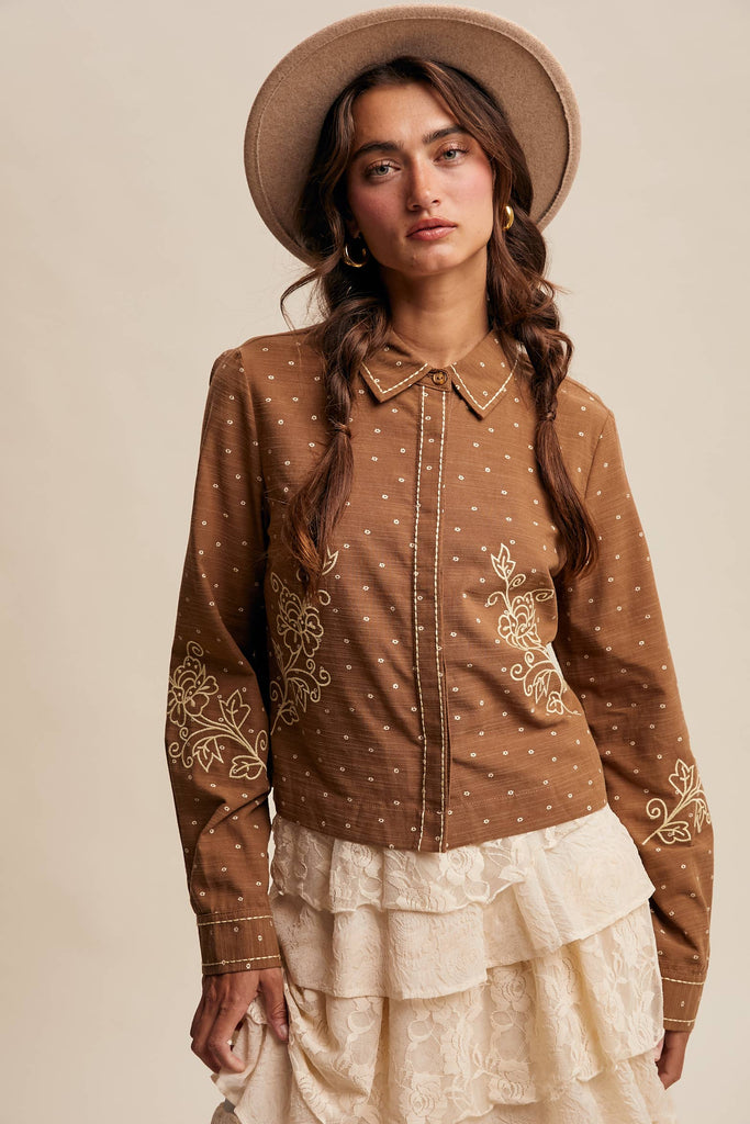 - Intricate Embroidery: Floral-inspired embroidery at the chest, sleeves, and cuffs adds handcrafted charm